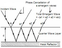 结构型吸波材料主要是依靠相消原理【1】来吸收电磁波的。相位相消型吸波材料是按照电磁波的干涉原理来设计的。现以单层吸波材料为例加以说明。把吸波材料放置在金属基体上,当厚度和入射电磁波长的关系满足:时,我们参看下图: